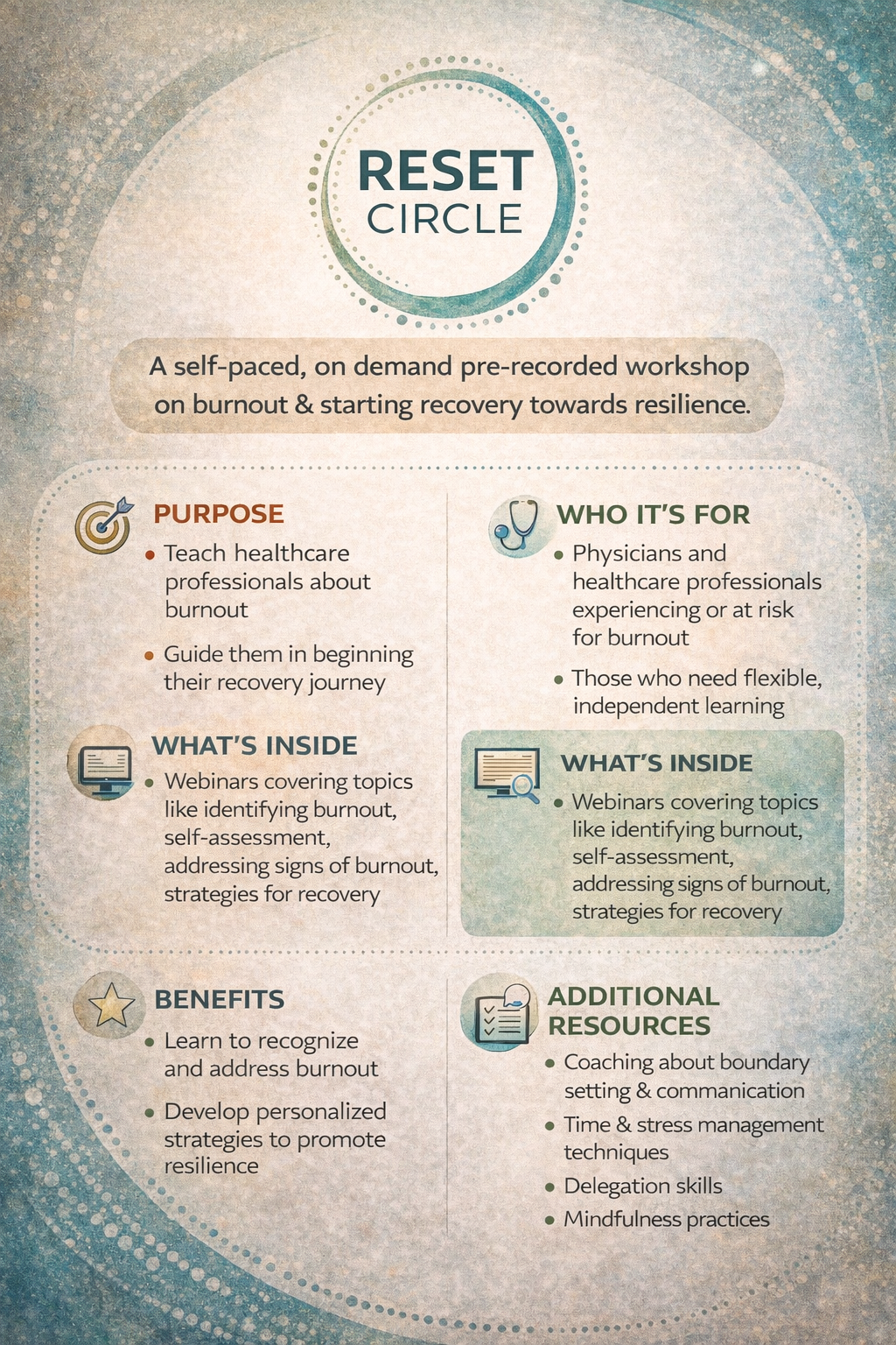 The Reset Circle is a monthly educational membership for physicians experiencing burnout, overwhelm, or nervous system depletion. Its purpose is stabilization, not decision-making. Reset focuses on restoring capacity so clearer thinking can return.